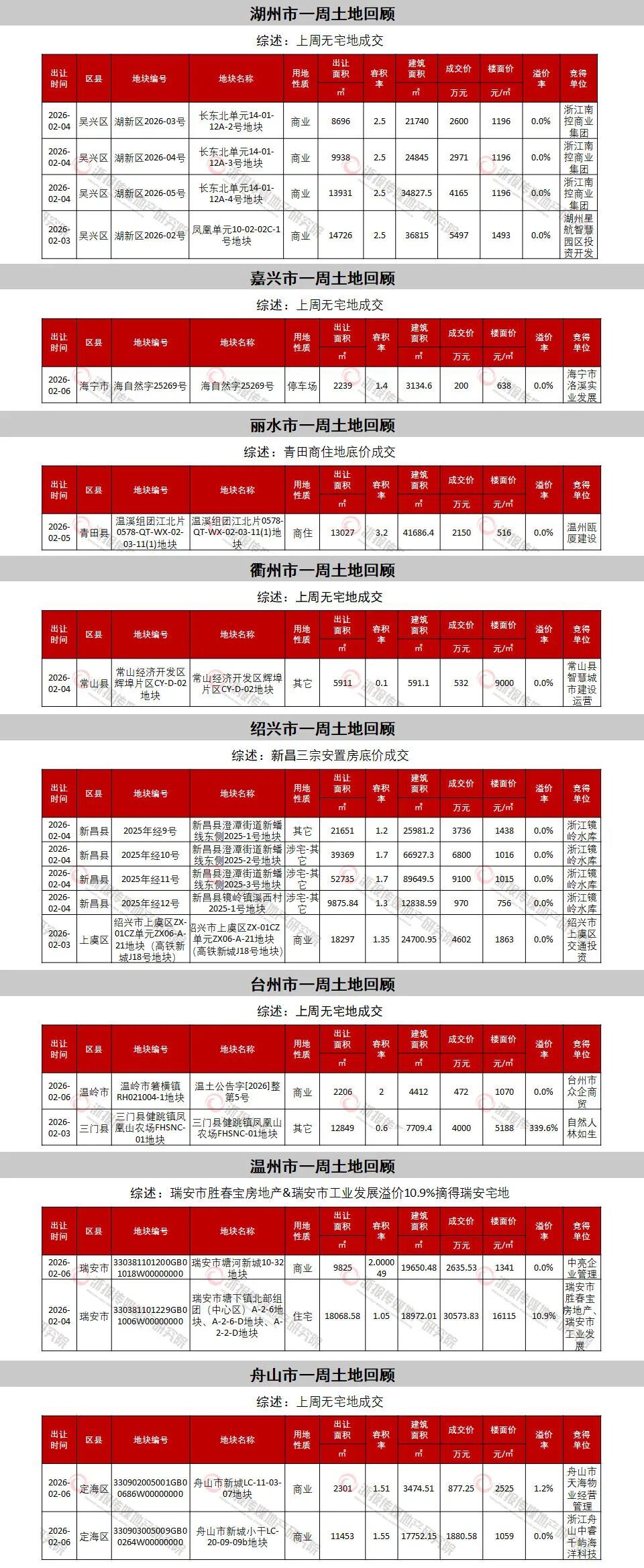2月10日:温州台州湖州5宗地块出让 楼面价每平米3122元起