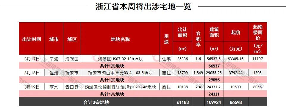住在杭州网3月16日讯(记者 岑天宇) 据浙报传媒地产研究院追踪统计,本周(3.16-3.22)浙江省拟出让涉宅地3宗(剔除纯租赁、纯安置,出让面积小于1000㎡的涉宅地,下同),体量11万㎡,总起价8.7亿元,平均起始楼面价6853元/㎡。