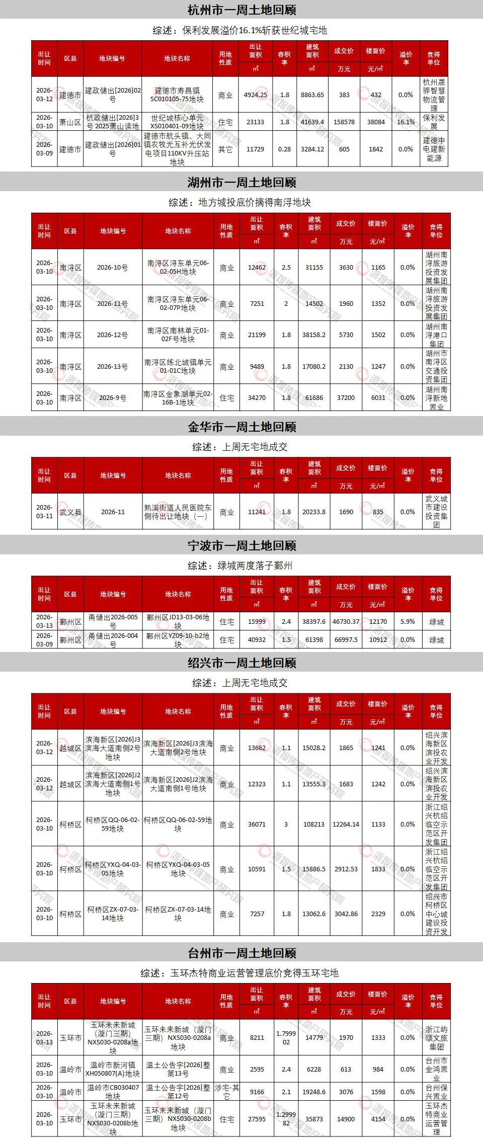 除此之外,保利发展再度落子杭州,溢价16.1%拿下萧山钱江世纪城宅地,成交楼面价38084元/㎡;玉环杰特商业运营管理底价竞得台州玉环地块;湖州南浔新地置业底价摘得湖州南浔宅地。