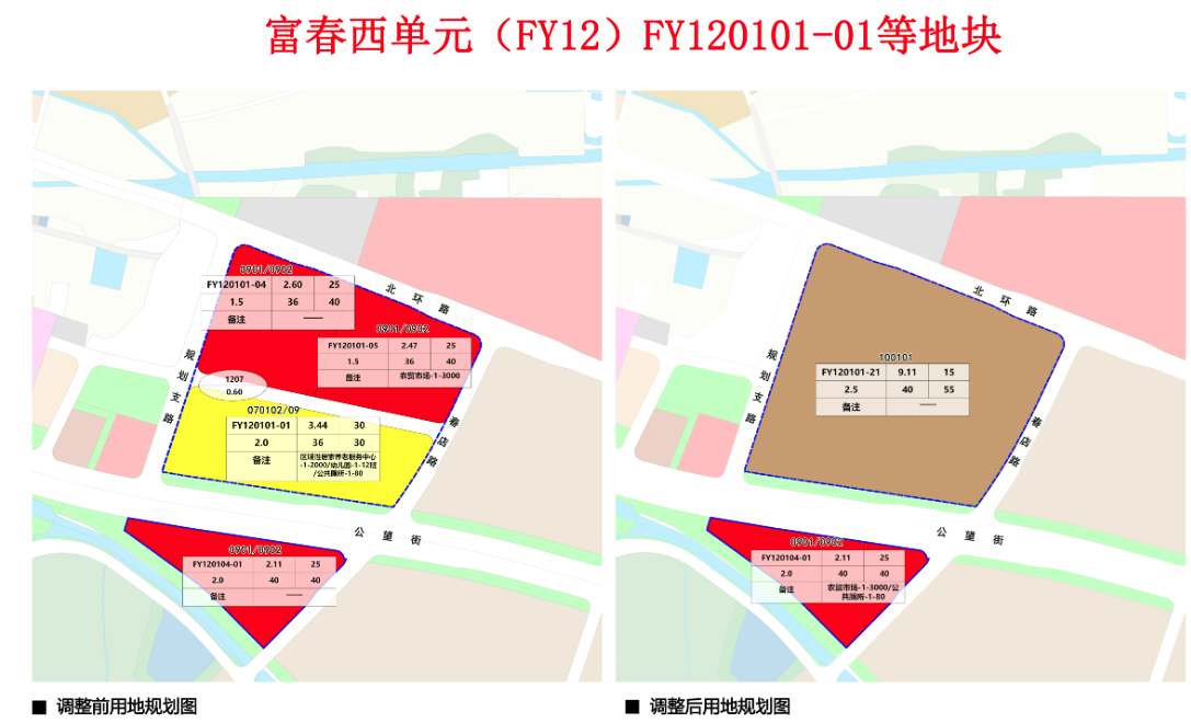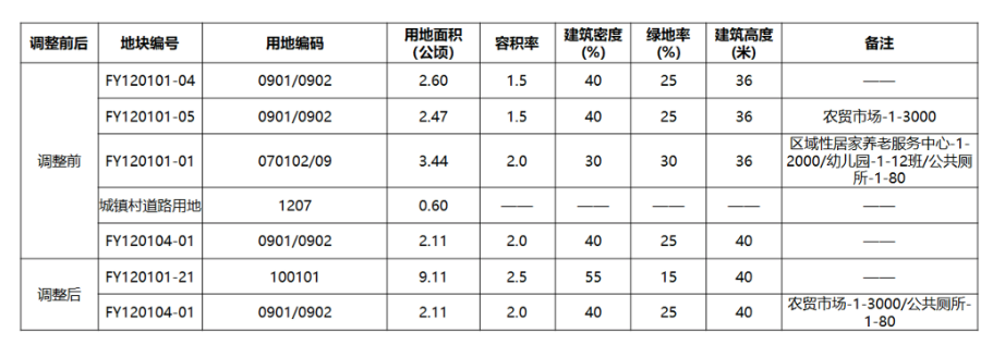 一是取消原规划支路,将两宗规划商办用地(FY120101-04、FY120101-05)、一宗规划住宅用地(FY120101-01地块)合并调整为一宗一类工业用地(FY120101-21);二是调整配套设施布局,经公服配套核查论证取消原规划中配建的幼儿园以及区域性居家养老服务中心,并将农贸市场和公厕调整至南侧FY120104-01地块集中设置;三是对FY120101-21地块容积率,建筑密度等指标进行相应调整。