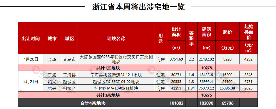 住在杭州网4月20日讯(记者 岑天宇)据浙报传媒地产研究院追踪统计,本周(4.20-4.26)浙江省拟出让涉宅地4宗(剔除纯租赁、纯安置,出让面积小于1000㎡的涉宅地,下同),体量18万㎡,总起价6.6亿元,平均起始楼面价4098元/㎡。