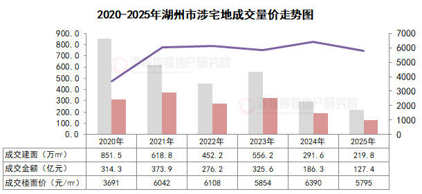 至此,湖州2025年土地成绩出炉:2025年,湖州市共计出让31宗涉宅地,成交金额127亿元,平均成交楼面价5795元/㎡,同比量价均有所下滑,成交金额为2017年以来低位。