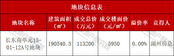吴兴区长东南单元15-01-12A号出让面积126827㎡,容积率1.5,建筑面积190540.5㎡。地块由湖州房总以113200万元底价竞得,成交楼面价为5950元/㎡。