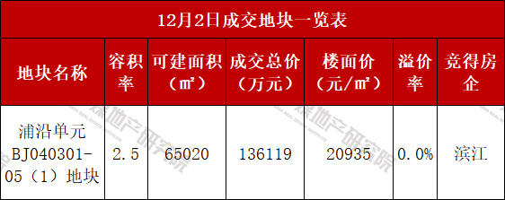 住在杭州网12月2日讯(记者 何肖霞)今日,滨江区浦沿地块由滨江房产以13.6亿元底价竞得,折合楼面价20935元/㎡,这是滨江区浦沿板块成交的第四宗宅地,也是小区域内10月以来出让的第三宗位置相近、地块条件相似的宅地,楼面价从10月的25317元/㎡、25108元/㎡直接下探超4000元/㎡。