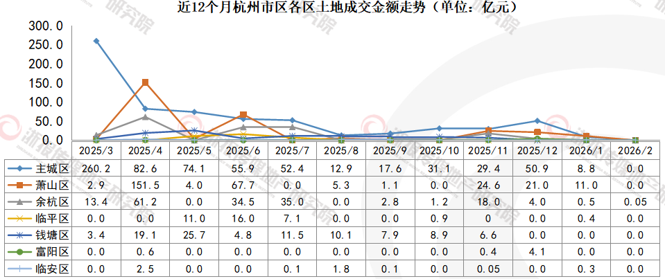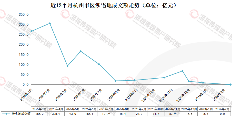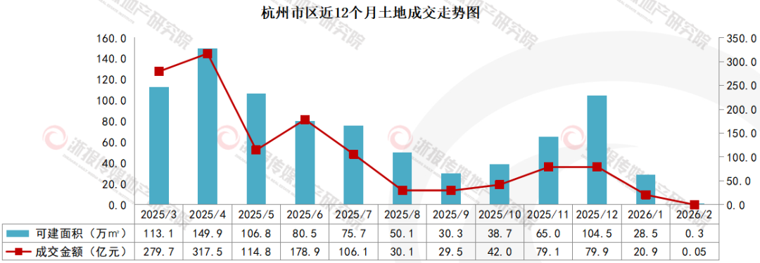 2026年2月,杭州市区共成交1宗地块,出让面积0.2万㎡(约3亩),总建筑面积0.3万㎡,成交金额0.05亿元。其中无涉宅地成交。