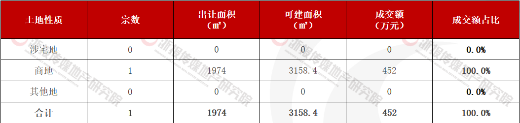 与此同时,1宗商业地成交,出让面积0.2万㎡(约3亩),总建筑面积0.3万㎡,成交金额0.05亿元;本月无其他地出让成交。