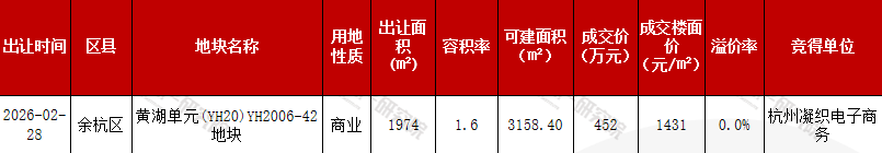 2026年2月,杭州市区无涉宅地出让成交。