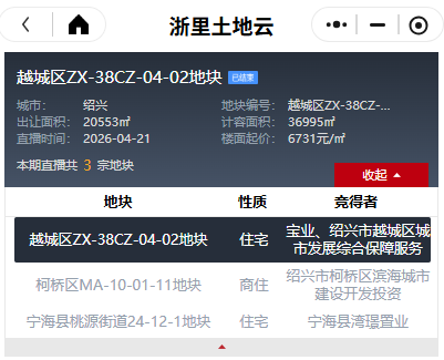 最终地块一轮底价成交,由宝业&绍兴市越城区城市发展综合保障服务以24900万元总价竞得,楼面价6731元/㎡。