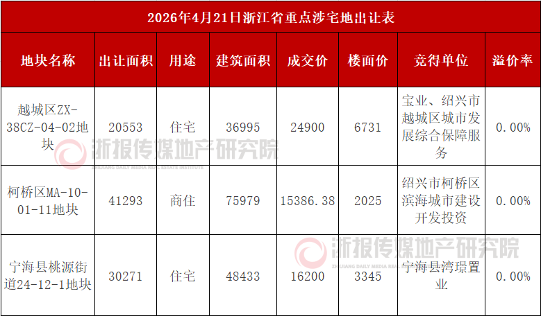 住在杭州网4月21日讯(记者 马梦婷)今日,绍兴柯桥、越城,宁波宁海各一宗涉宅地出让。最终三宗地块都以一轮底价成交,均为本土企业拿地。