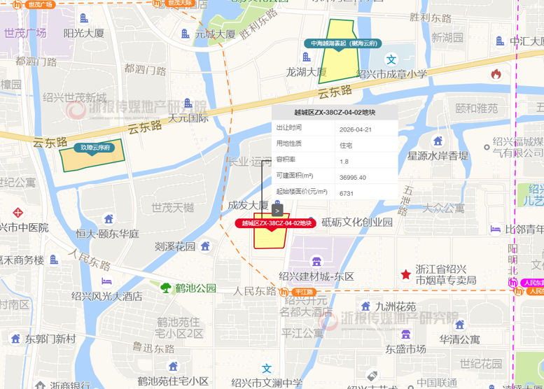 绍兴越城区ZX-38CZ-04-02地块出让面积20553㎡,容积率1.6,体量约3.7万㎡,东至平江路,南至规划道路,西至富中路,北至成发大厦。附近有蕺山小学迪荡校区(成章小学)、建功中学迪荡校区、世茂广场、秀水小学、越城区人民医院、绍兴市体育中心等综合配套。附近中海越湖雲起(樾海云府)2025年4月成交楼面价9844元/㎡,当前新房均价约2.8万元/㎡。
