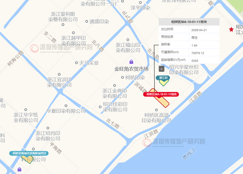最终地块1轮底价成交,由绍兴市柯桥区滨海城市建设开发投资以15386.38万元总价竞得,楼面价2025元/㎡。