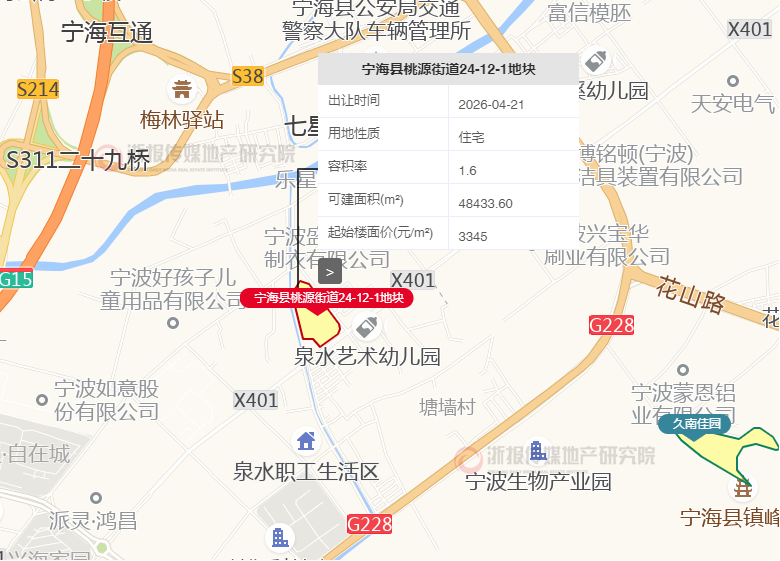 宁波宁海桃源街道24-12-1地块出让面积30271㎡,容积率1.6,体量约4.8万㎡,配套商业用房建面不大于10%。