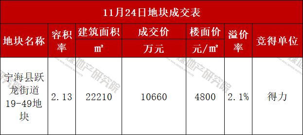 住在杭州网11月24日讯(记者 魏盼)11月24日,宁海跃龙街道再出一宗涉宅用地,经12轮报价,由宁波宁海本地大型房企得力以总价10660万元竞得,楼面价4800元/㎡。