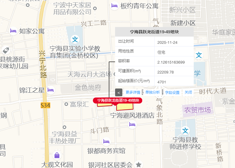 宁海宅地位于宁波宁海县老城区跃龙街道,地块出让面积10446㎡,容积率2.13,可建面积22209.78㎡,地块起价10440万元,折合楼面起价4701元/㎡。