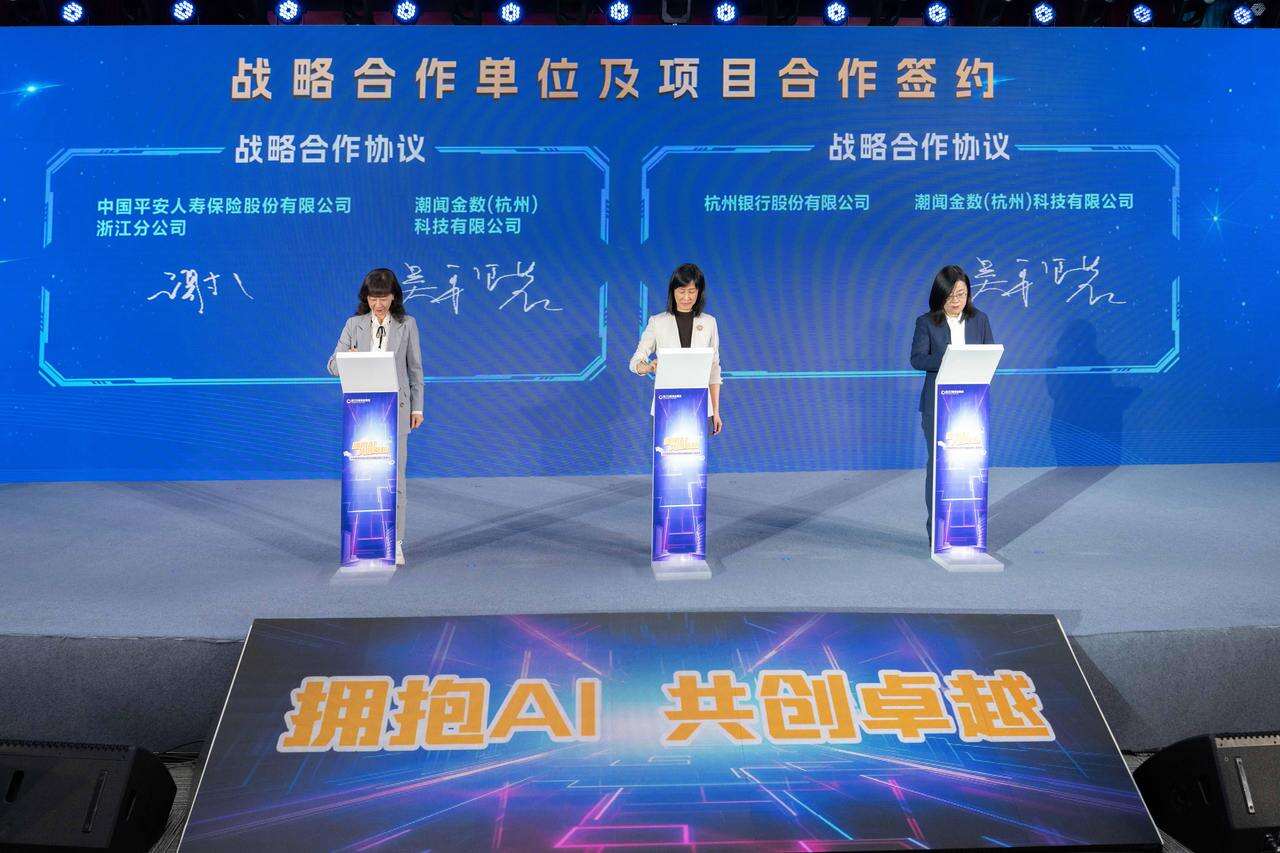 活动现场举行了战略签约仪式,仪式分7批次进行,共达成14组合作,覆盖能源、金融、文旅、科技等多个领域。潮闻金数(杭州)科技有限公司(以下简称“潮闻金数”)作为潮闻天下旗下重要数字科技企业,与中国平安人寿保险股份有限公司浙江分公司、联通数据智能有限公司、杭州银行股份有限公司等三家知名企业现场完成战略签约,以扎实的合作成果为数据要素的价值释放注入澎湃动力,成为活动现场的焦点之一。