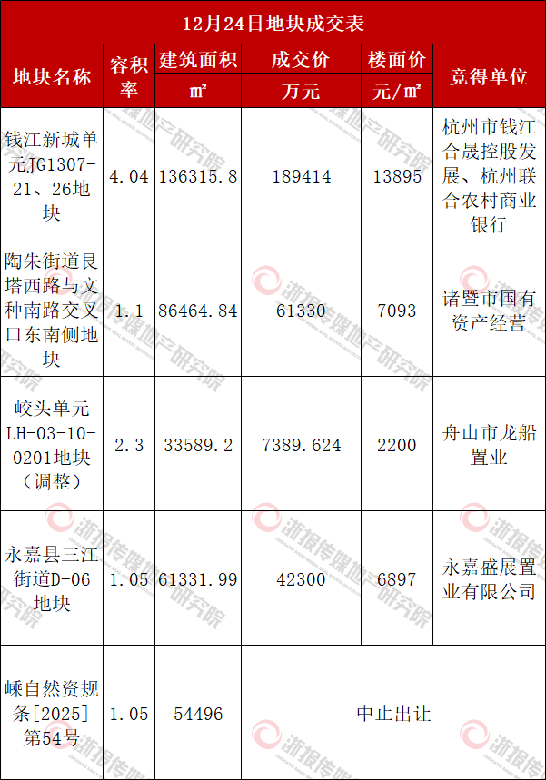 住在杭州网12月24日讯(记者 魏盼)12月24日,杭州、绍兴、温州、舟山四宗地块成交。