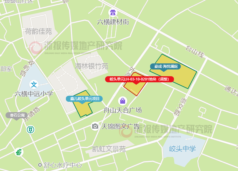 其余两宗由本地民企竞得。舟山普陀地块位于六横岛上的六横镇,毗邻舟山天合广场,周边还有普陀人民医院六横分院、峧头集贸市场、中远小学、峧头中学等。地块出让面积14604㎡,容积率2.3,可建面积33589.2㎡。