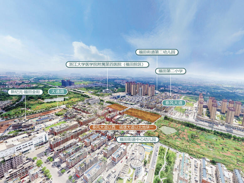 两宗地块距离义乌国际商贸城均在1km范围以内,周边区域价值显著。福田湿地公园、浙江大学医学院附属第四医院等优质配套环伺。