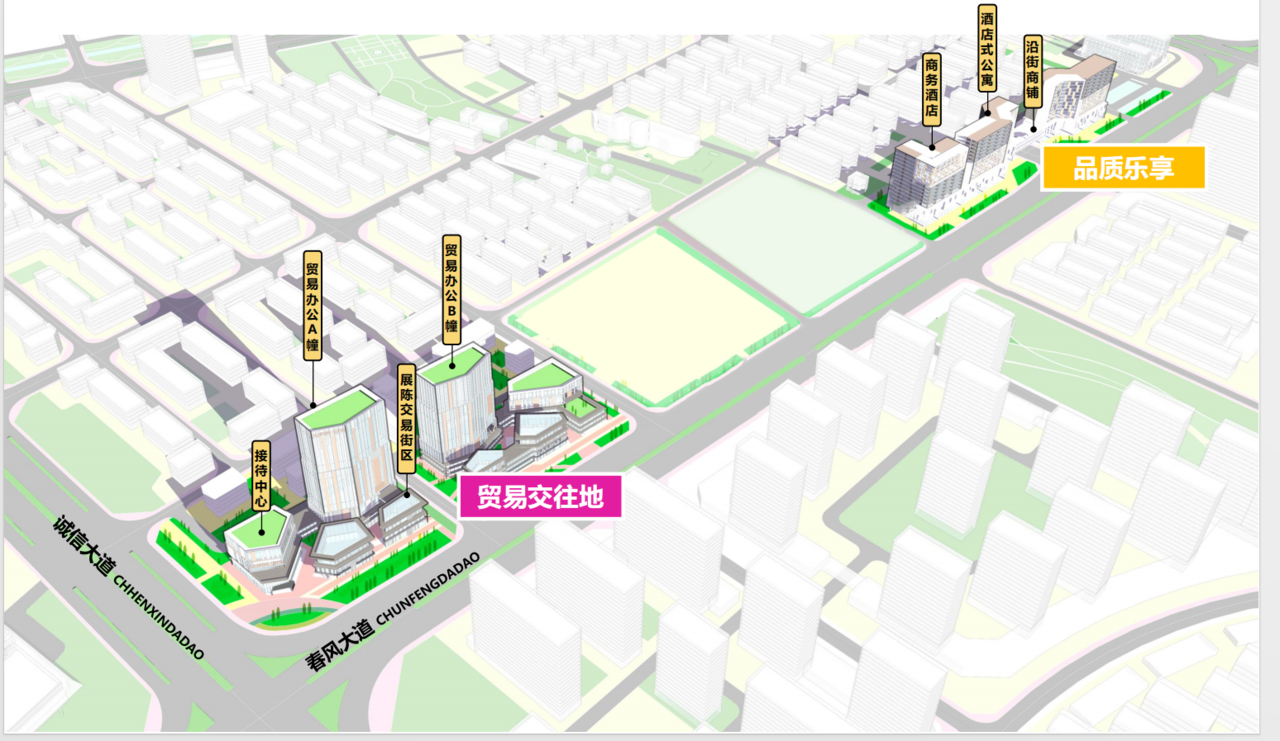 除垂直楼产品外,两宗地块未来将打造一定的商务办公、酒店等相关产品,一方面能满足商贸城业主的商业商务需求,另一方面也将极大改善该区块的城市界面。