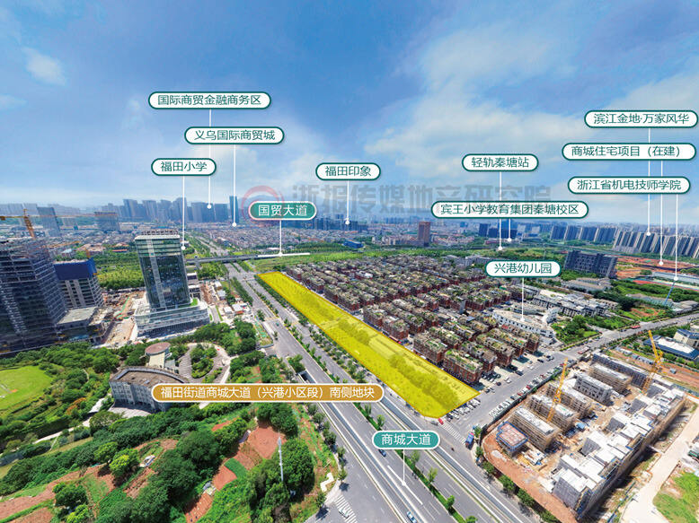 福田地块位于商贸城区块,沿商城大道步行1km即可到达义乌国际商贸城,周边配套齐全,福田小学、稠城街道社区卫生服务中心、轻轨秦塘站等优质配套环伺。