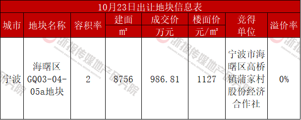 住在杭州网10月23日讯(记者 郑青青 通讯员 万雪丽)今日,宁波海曙城西出让一宗小体量商服用地。最终,海曙区GQ03-04-05a地块由宁波市海曙区高桥镇蒲家村股份经济合作社成功竞得,成交总价986.81万元,折合楼面价1127元/㎡。
