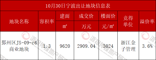 住在杭州网10月30日讯(记者 郑青青 通讯员 万雪丽)今日,宁波鄞州姜山板块出让一宗商业用地。