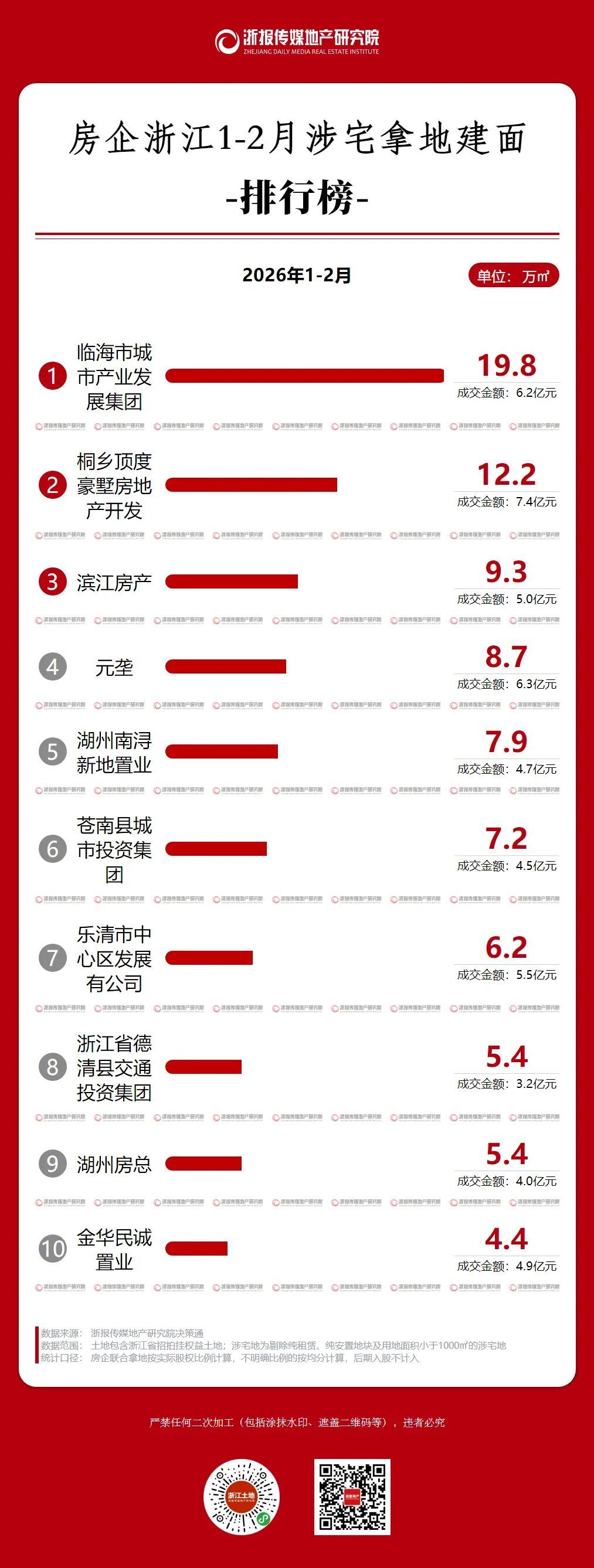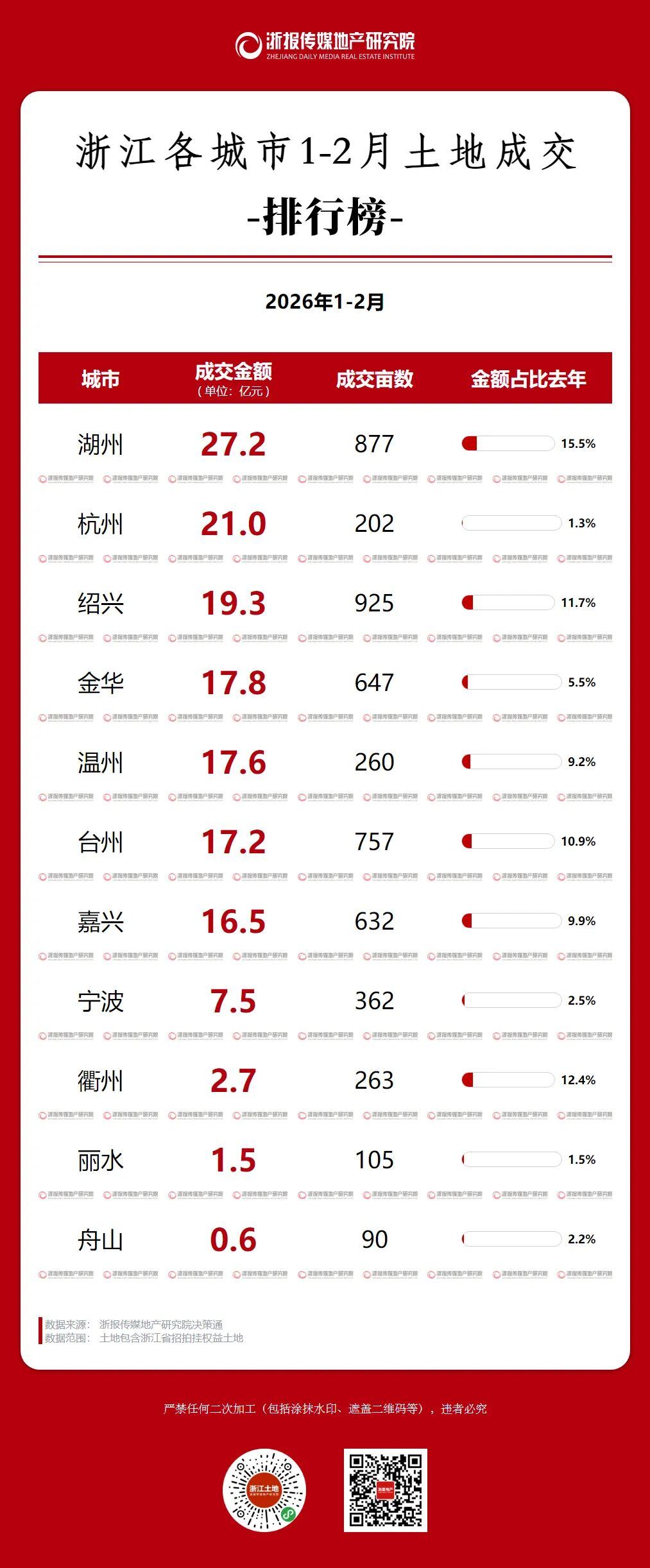 浙江1-2月土地榜:湖州27.2亿元领跑