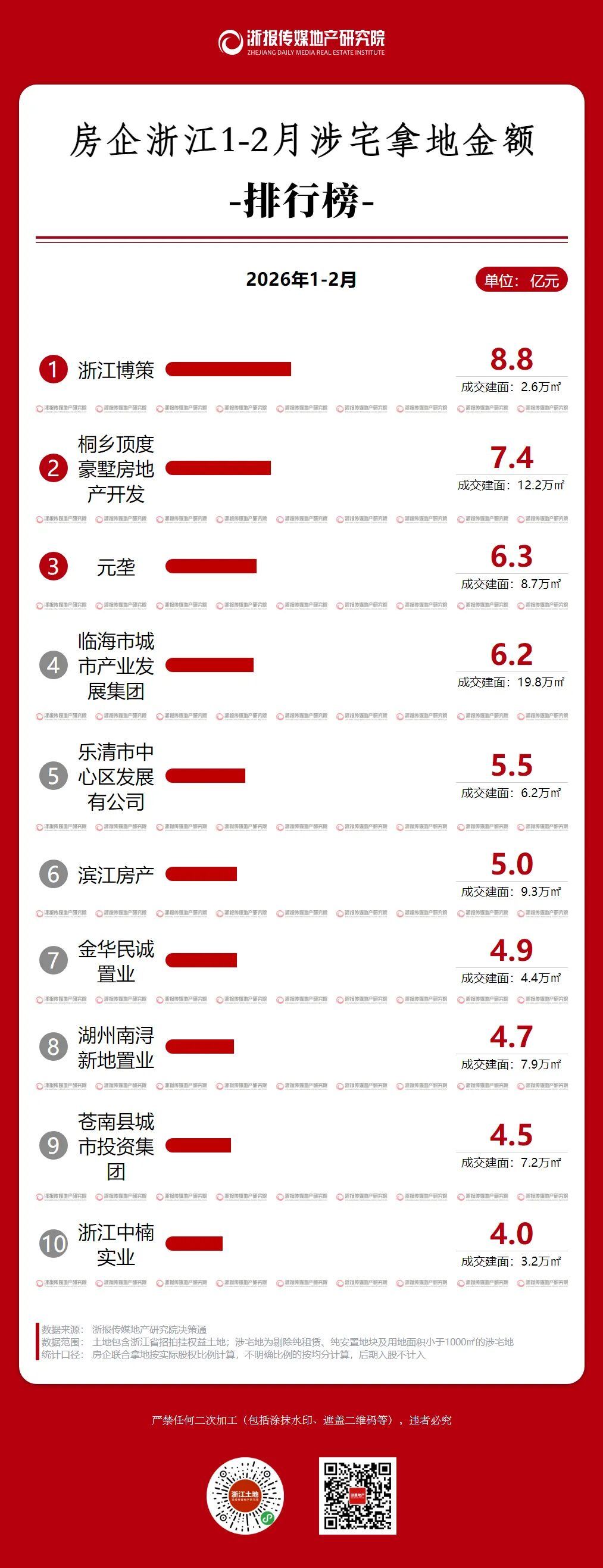 从排行榜看,浙江博策竞得杭州拱墅区1宗宅地,以8.8亿元拿地金额位居榜首。其次为桐乡顶度豪墅、浙江元垄,拿地金额分别为7.4亿元、6.3亿元。滨江房产拿地金额5亿元,仅排名第6。