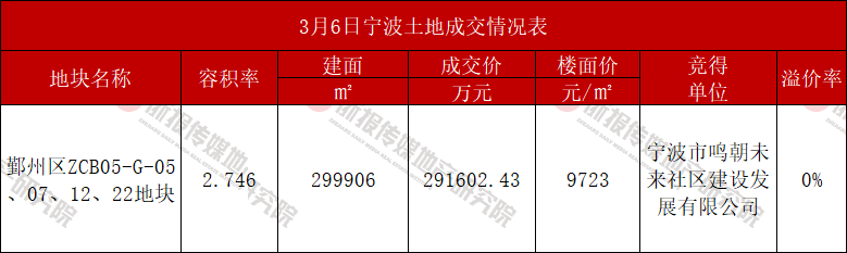 住在杭州网3月6日讯(记者 郑青青 通讯员 万雪丽)今日,宁波市成功出让春节后首宗涉宅用地——鄞州区ZCB05-G-05、07、12、22地块,由地方国企宁波市鸣朝未来社区建设发展有限公司(鄞开集团)以29.16亿元总价竞得,综合成交楼面价9723元/㎡。