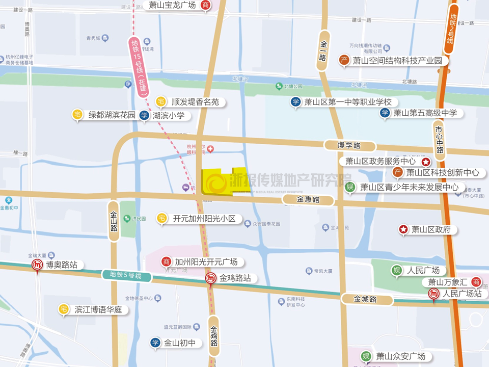 地块南侧的金惠路,更是萧山区府大院门前的主干道。萧山区政府、萧山区科技创新中心、萧山区政务服务中心、萧山图书馆、萧山剧院、浙江萧山医院等城市顶级公共资源配套,集聚于此,皆在步行可达的范围内。