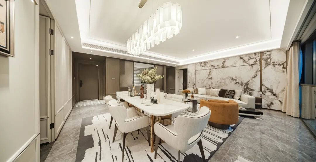 踏入建面约108㎡户型样板间,即刻被其突破面积桎梏的空间效率所震撼。方正格局打造稀缺全功能四房,极致满足多代同堂或多元进阶需求。约12.7m超阔南向采光面,阳光倾泻满室,厅卧沐浴写意暖阳。主卧套房设计尽显私密尊崇,客餐一体奢阔横厅营造无界通透视野,精装背景墙质感交付即刻呈现眼前。