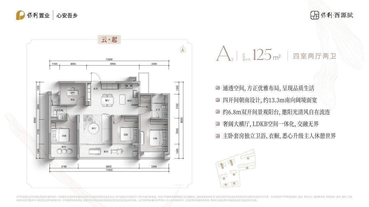 深刻洞察高阶改善客群需求,西源赋打造创新全四房产品,兼顾尺度、功能与场景感。以建筑面积约125㎡户型为例,四开间朝南,南向约13.3米超级面宽,短进深,纵览无界视野;LDBK一体化设计,搭配约6.8米宽阔阳台,室内外景致相连,律动的生活场景成为家中最动人的风景。