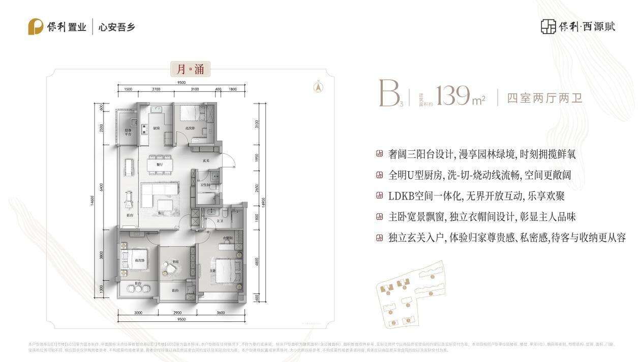 而建筑面积约139㎡户型,边厅设计,270°优异采光,全明通透,超80%高得房率;约38㎡阔境方厅,赋予家尺度感和尊贵感,成为家庭生活的核心场域;主卧套房以约26㎡的奢阔尺度,集睡眠区、独立卫浴、步入式衣帽间于一体,营造从容而私密的尊崇生活体验。