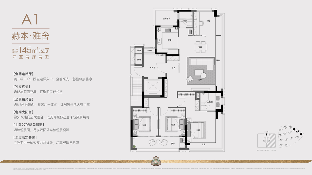 于145边厅户型,玄关处的大师手绘屏风,主卫亚马逊绿奢石台面、日本皇室御用伊奈智能马桶等配置,种种奢侈设计,皆于细节处,尽显大家风范。