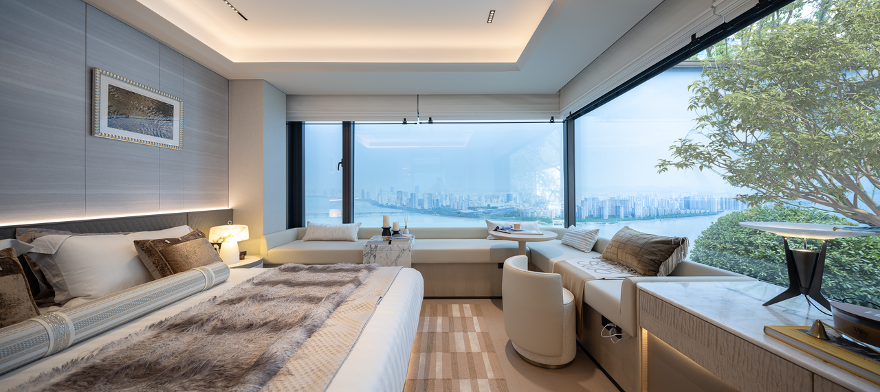 主卧270°视野,也将窗框转化为取景框。伴着星云入梦,枕着朝阳醒来,自然的价值,就此润物无声地成为每天的视觉享受。