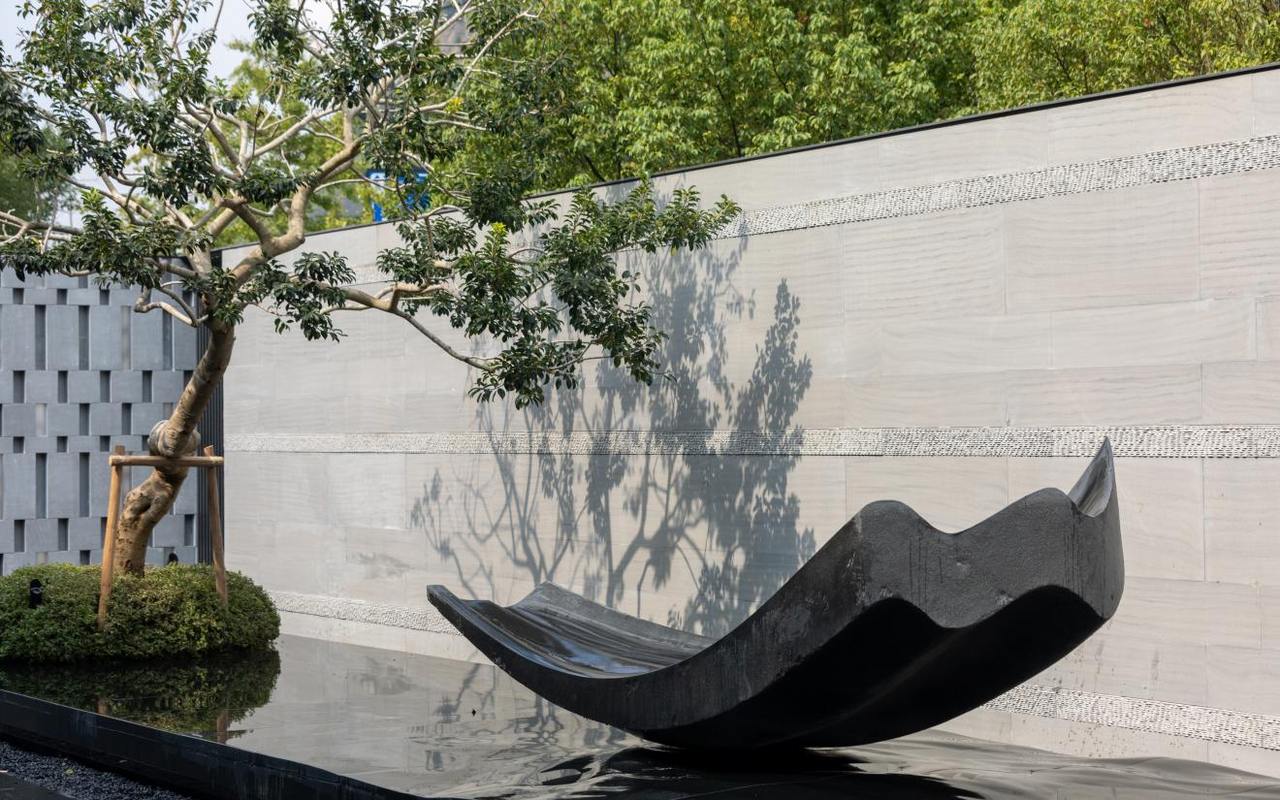 这种 “转译” 不是简单的 “场景复刻”,还兼顾了现代生活需求。比如面向主水景的茶亭,既有宋代文人聚会的风雅,又配备了现代遮阳设施,雨天时金属帘幕落下,雨声打在帘上成珠,业主可在室内安心品茶;进门两侧池塘里,养着象征好运的锦鲤,墙面还刻有书法大师题写的 “無” 字,锦鲤游动时仿佛在字间穿行 —— 既留住了 “观鱼趣” 的诗意,又添了几分灵动禅意,让古人的浪漫与当代的舒适,达成了恰好的平衡。