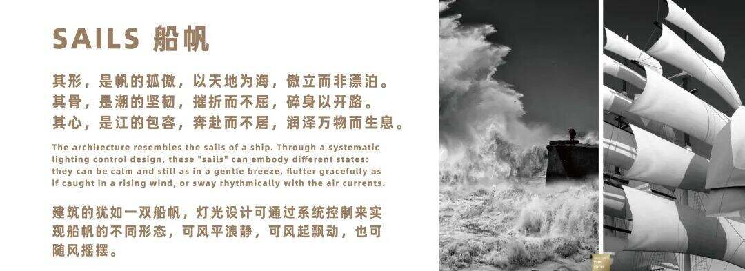 同样融入光影灵感的,还有钱塘江上扬帆起航的船帆,设计团队提取了船帆与江潮律动共生的场景,让建筑从静止的状态,转换为一个能讲述故事、表达情绪的生命体,进而展现出杭州封面地标最具力量的光影艺术。