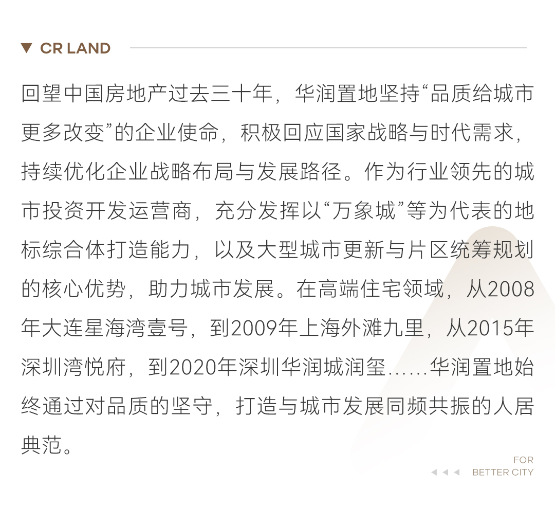 在喧嚣善变的市场中,选择坚守价值的恒定;在浮躁短视的时代里,坚持仰望历史的星空。以恒心致初心,以作品致时代,华润置地将持续以创新回应时代需求,以品质承载永恒价值,以人文唤醒建筑生命,为中国高端居住领域探索新的可能。