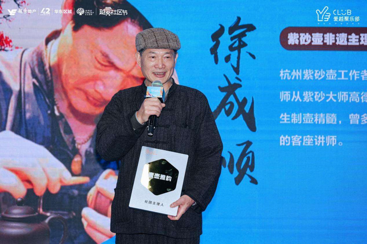 更令人动容的是,【壹壶雅韵】紫砂壶非遗传承人徐成顺先生登台致辞。他出生于上海茶楼世家,年少时师从紫砂大师高德芝先生,深得传统技艺精髓,将岁月凝入器皿,将匠心化入茶汤。致辞中,他温声分享:“愿以一盏茶的时间,带大家走进东方生活的雅韵,那里有器物之美,有光阴之静,更有邻里因共同热爱而滋长的温情。”