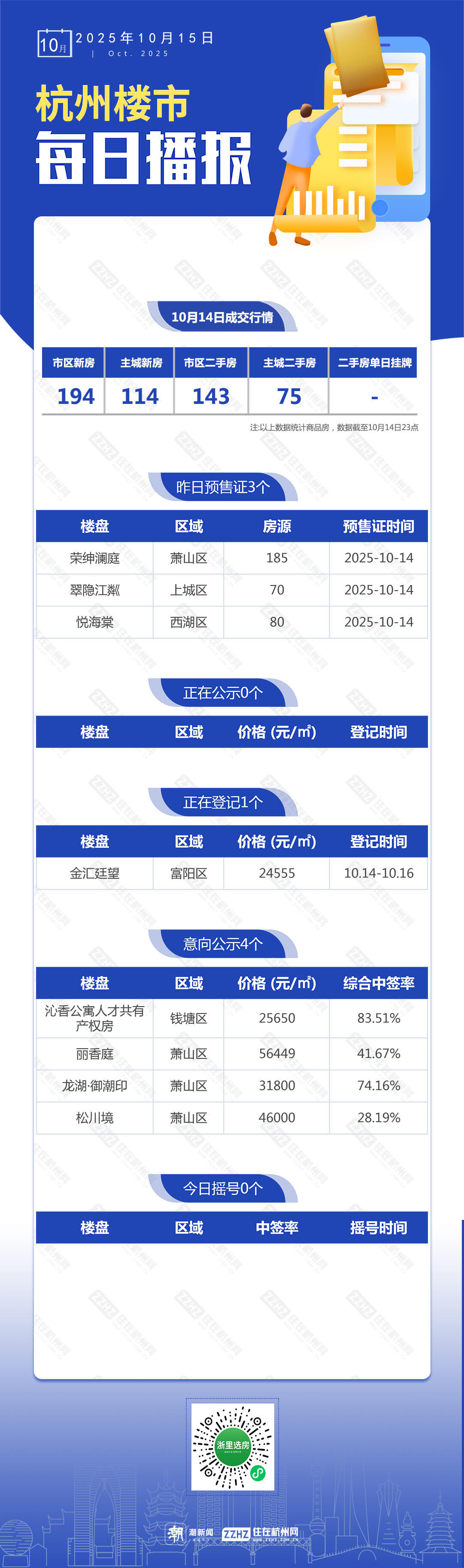 10月15日,杭州新房5盘预售,1盘报名中