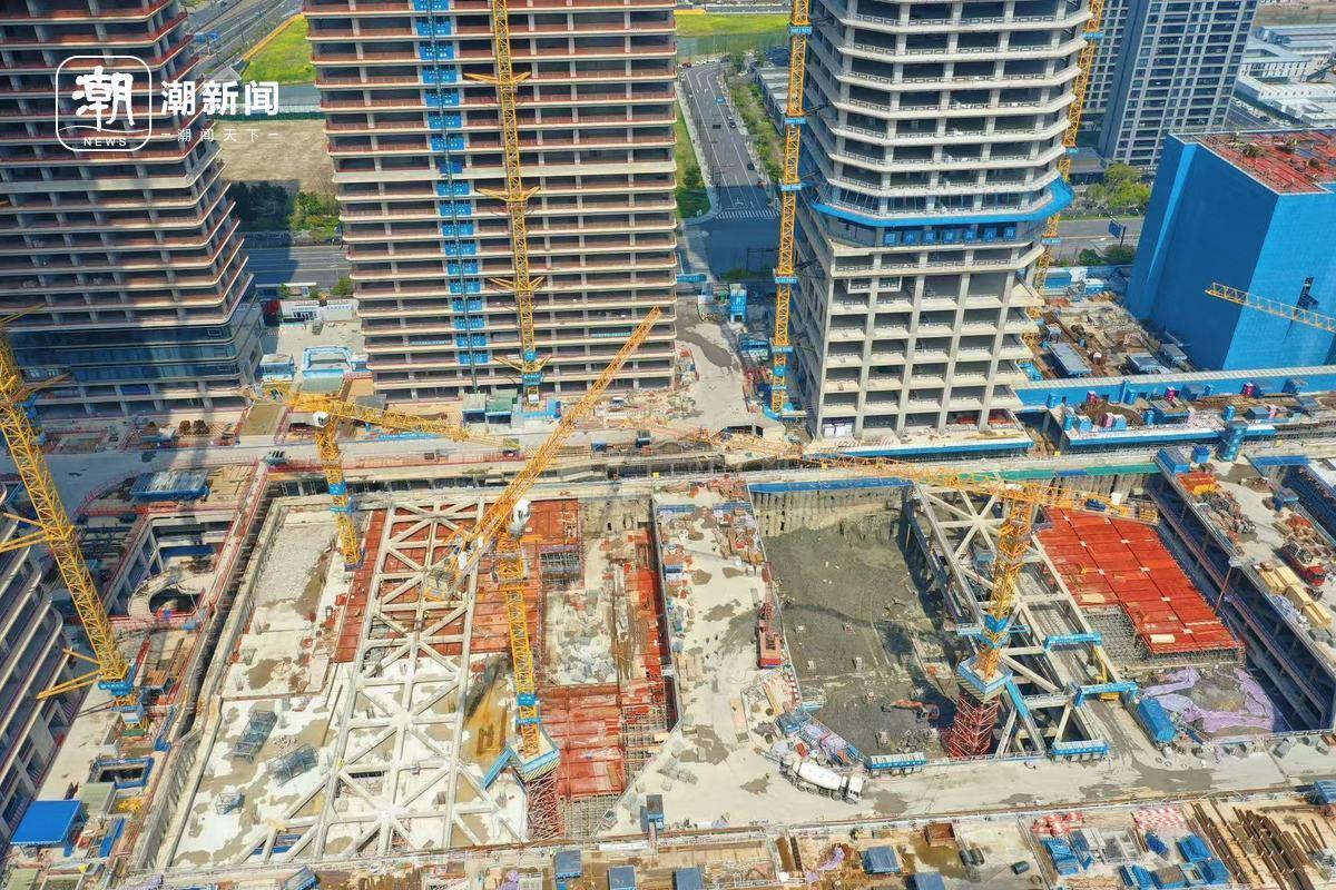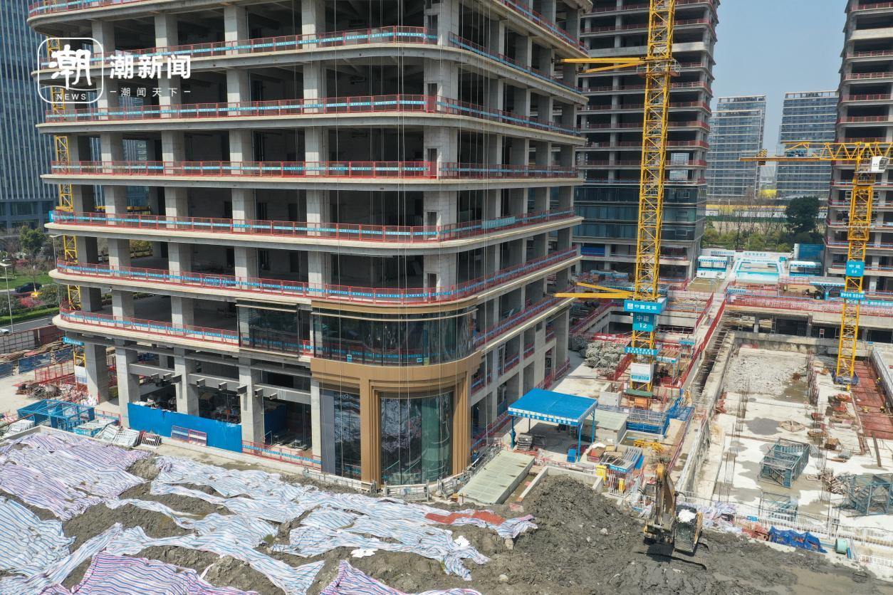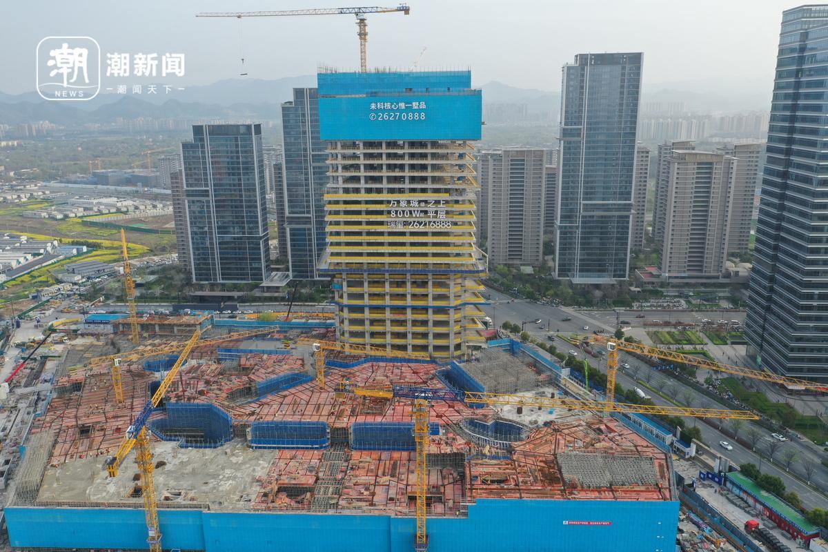 从俯瞰角度看,绿汀路万象目前除了写字楼已经有20多层露出地面,其余还在地面施工阶段,商业计划2027年开业。它的西面就是已经交付的红盘杭城未来中心,目前签约均价在4万元/平方米左右。