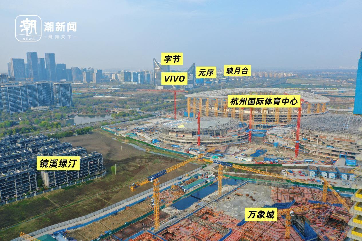 换个角度看,绿汀路万象城的东面,是正在建设的杭州国际体育中心,是余杭区乃至杭州非常重要的综合性体育设施。再往东北角,是字节、VIVO等大厂的“身影”,而它们中夹着的就是目前杭州热门楼盘元序,目前已经进入到第三次开盘,前两次都以热销告终。