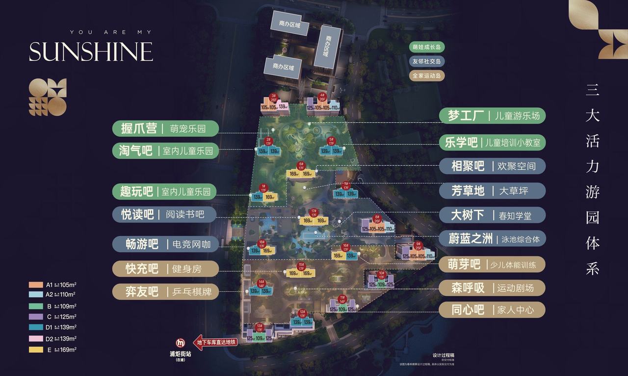 春来晴翠以“全龄共生”为内核,打造萌娃成长岛、友邻社交岛、全家运动岛三大活力游园体系: