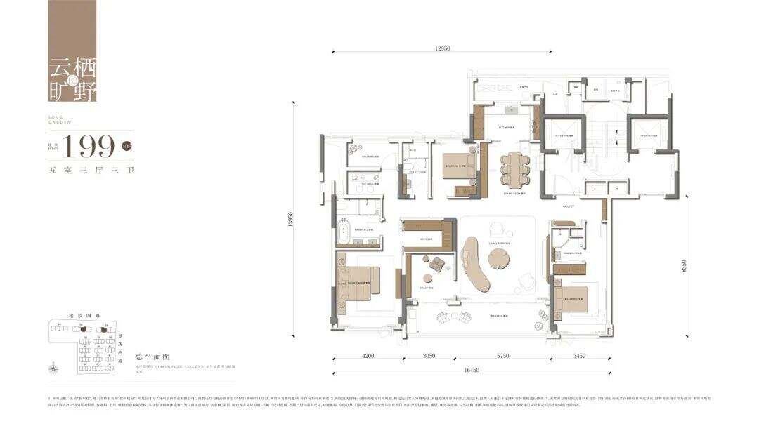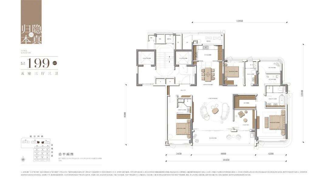 建面约199㎡户型四开间朝南布局,南向面宽约16.5米,餐客厅空间达到近50㎡,室内整体得房率达到约93%。