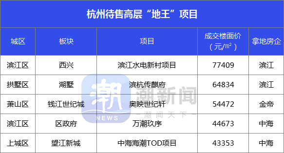 目前,楼面价排名前列的项目,包括滨江水电新村项目、滨杭传麒府、奥映世纪轩、万潮玖序、中海海潮TOD项目,都规划高层房源,且高层住宅均价都放风“10字头”。其中,沿江的滨江水电新村项目有消息称,顶跃房源单价甚至冲破20万元/㎡。