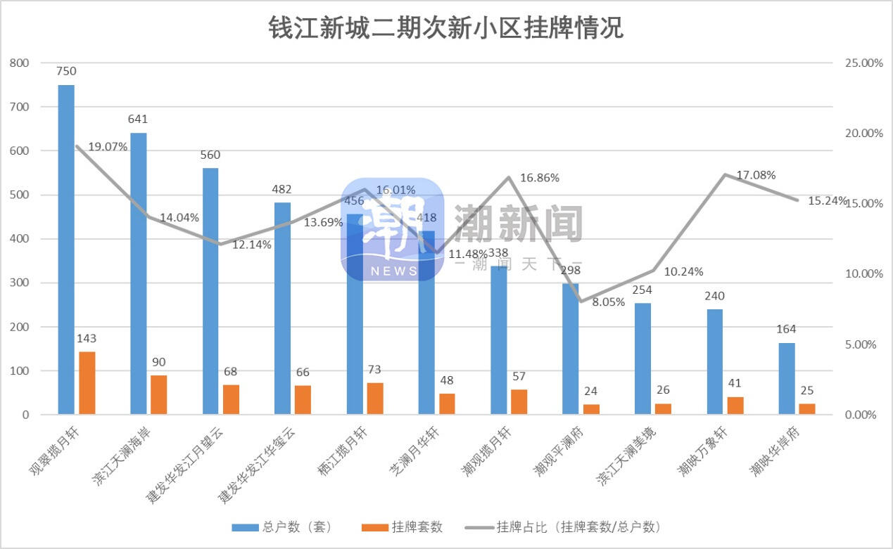 杭州贝壳研究院数据显示,钱二11个已进入二手房市场的次新小区,总可售房源套数4601套,挂牌房源套数661套,挂牌占比约14.4%。