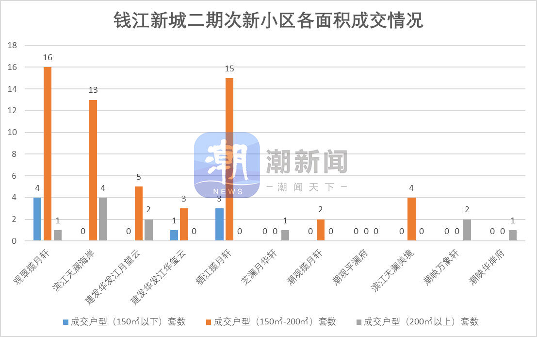 从户型维度来看,钱二成交套数最多的户型区间为150-200㎡的中等大户型,成交占比达到3/4左右。