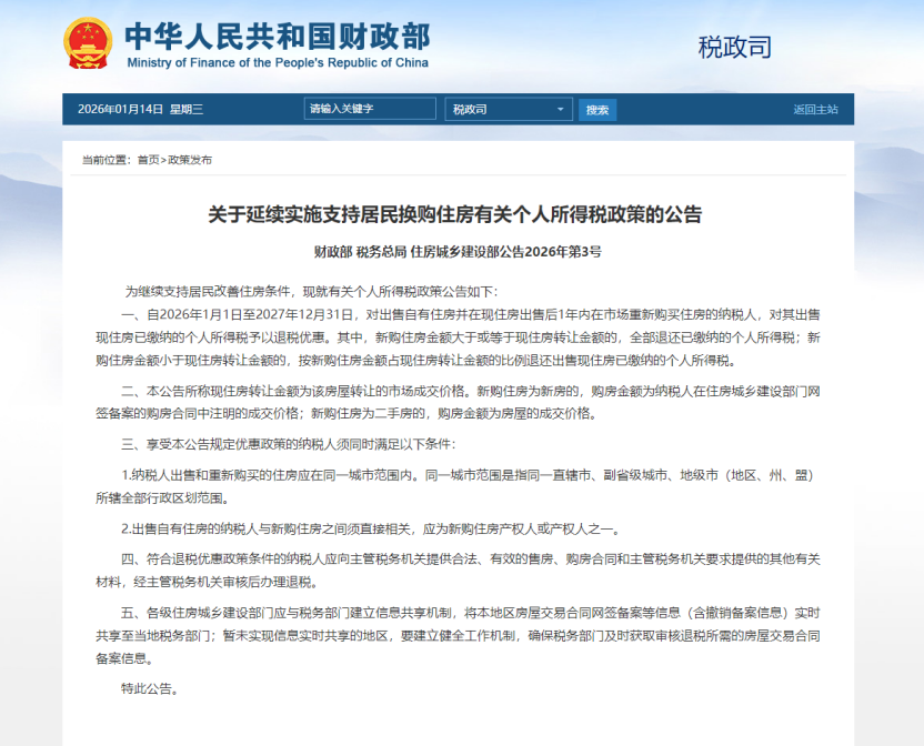 住在杭州网1月14日讯(记者 詹慧雯)1月14日,财政部、税务总局、住房城乡建设部联合发布《关于延续实施支持居民换购住房有关个人所得税政策的公告》。(以下简称《公告》)