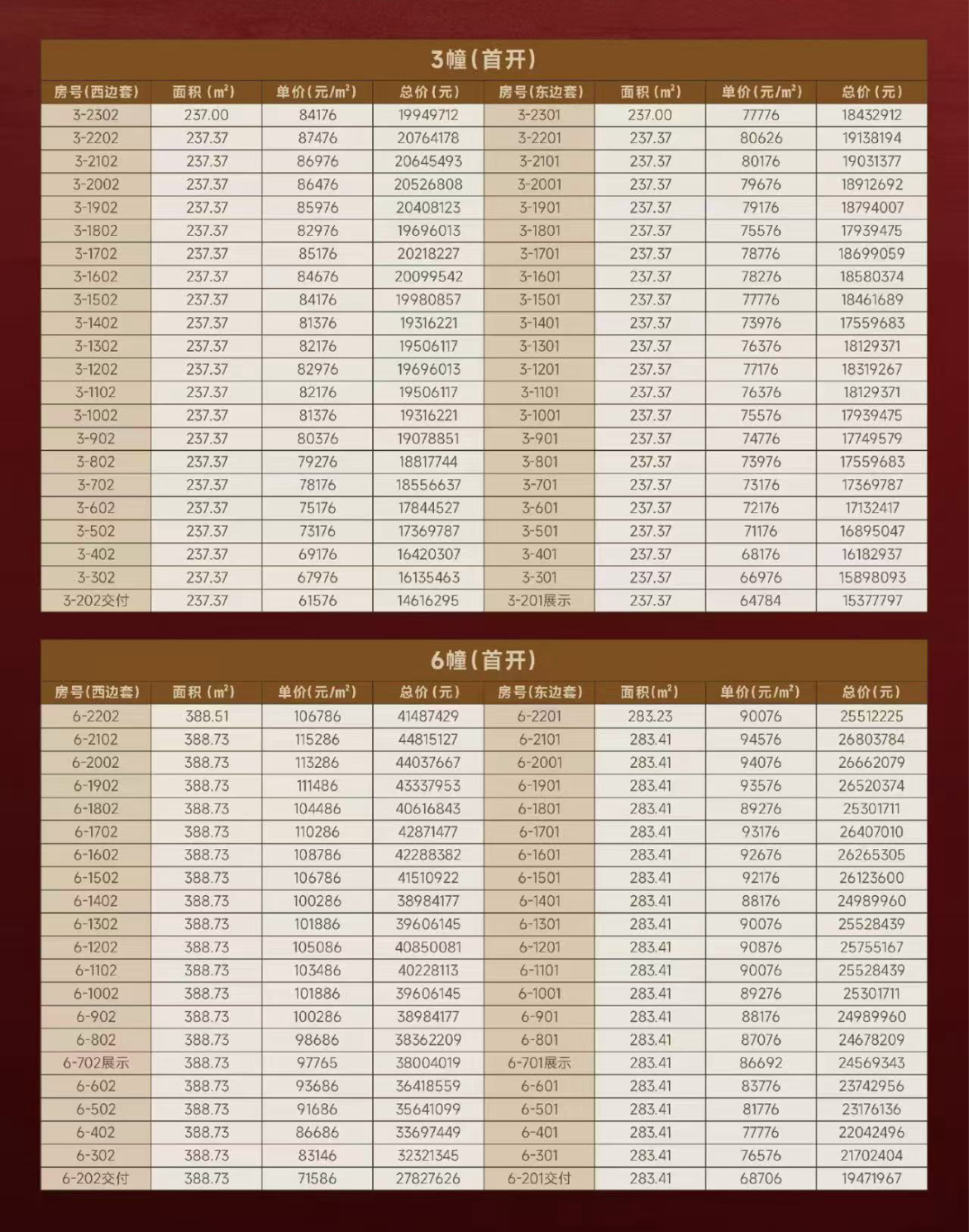 6#西边套,有江景视野的约388㎡户型,均价在10.06万元/㎡左右;6#东边套,约283㎡户型,均价在8.76万元/㎡左右。3#西边套,约238㎡户型,均价在8.01万元/㎡左右;3#东边套,约238㎡户型,均价在7.51万元/㎡左右。