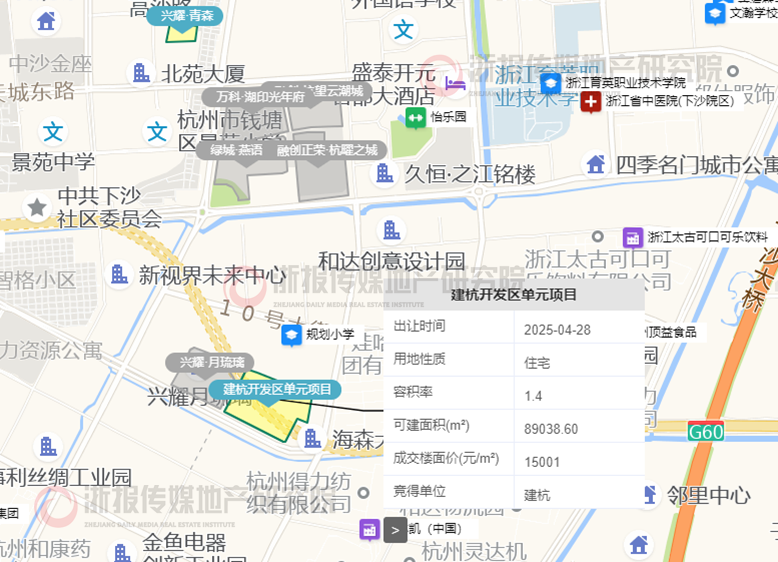 2025年4月28日,浙江建杭置业集团有限公司(建杭)以133567万元竞得开发区单元JS0903- 20地块,楼面价为15001元/㎡,溢价率为0.0%。